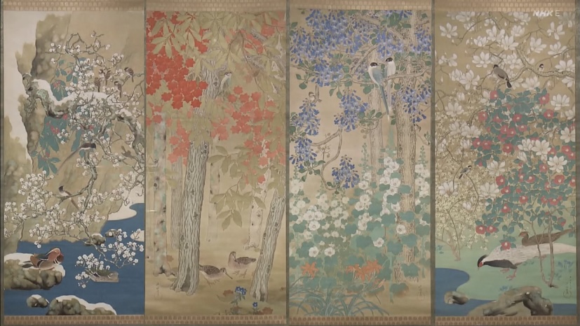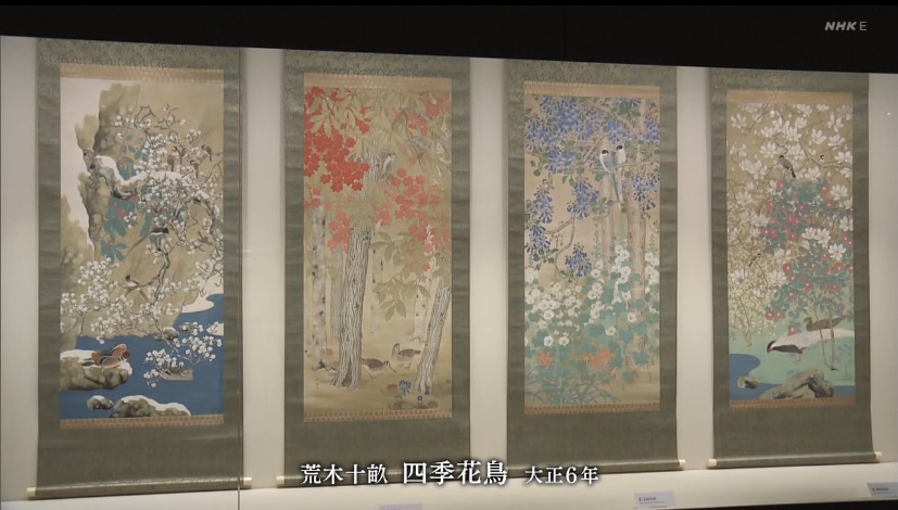 これは四季の花鳥を装飾性豊かに描き出した荒木十畝(あらきじっぽ)の作品。