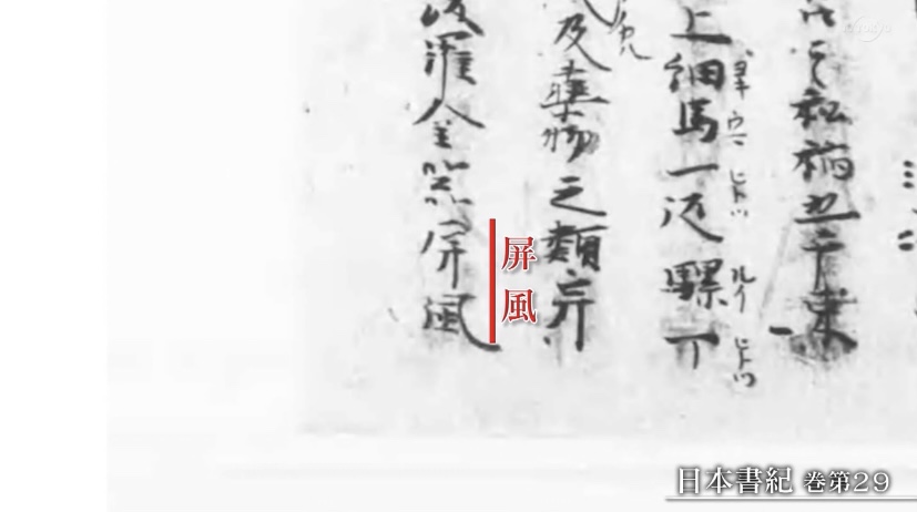 日本において「屏風」という言葉が初めて登場するのは『日本書紀』で、新羅から天武天皇に贈られたとある。