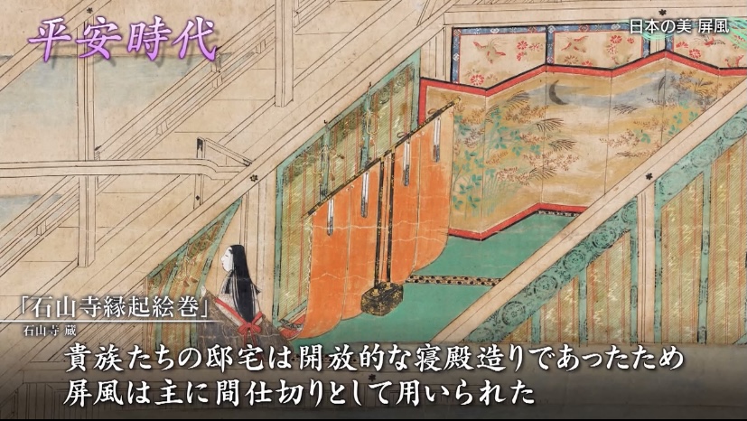 平安時代、貴族たちの邸宅は開放的な寝殿造りであったため、屏風は主に間仕切りとして用いられた