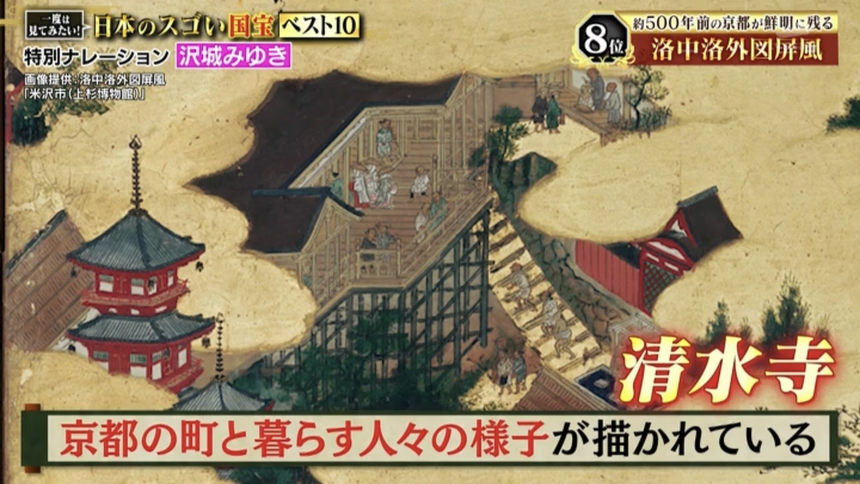 『洛中洛外図屏風(上杉本)』には清水寺や鹿苑寺金閣も描かれており、美術品としてだけではなく、歴史的な資料としても重要な側面を持っています。
