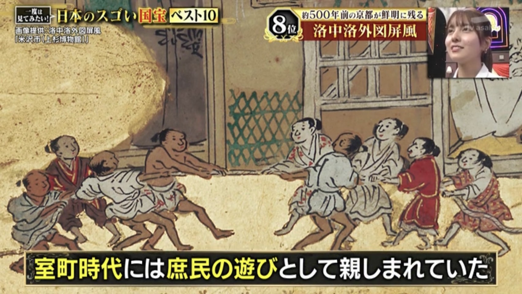 当時の京都の庶民の暮らしや遊びも描かれており、こちらでは綱引きをする人々が描かれています。