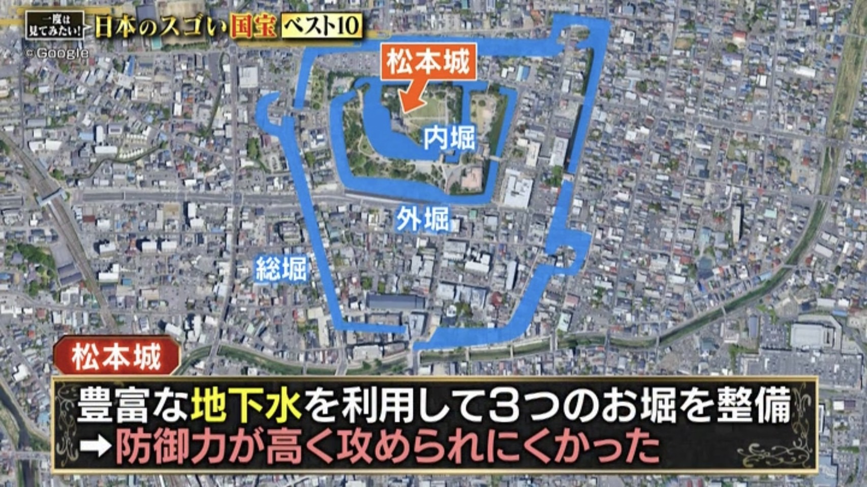 松本城の周辺には豊富な地下水があり、それを使った3つお堀を作ることで、防御力の高い城としました。